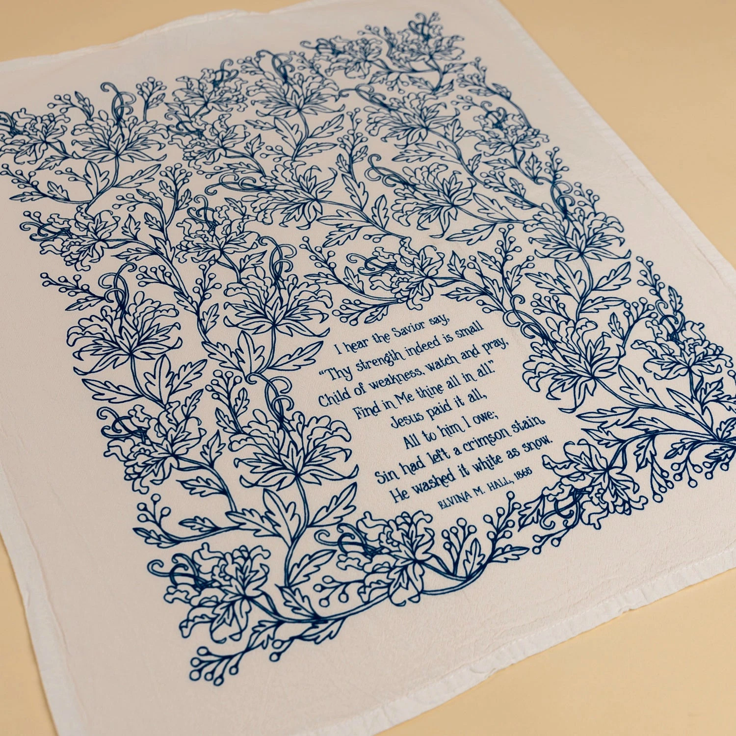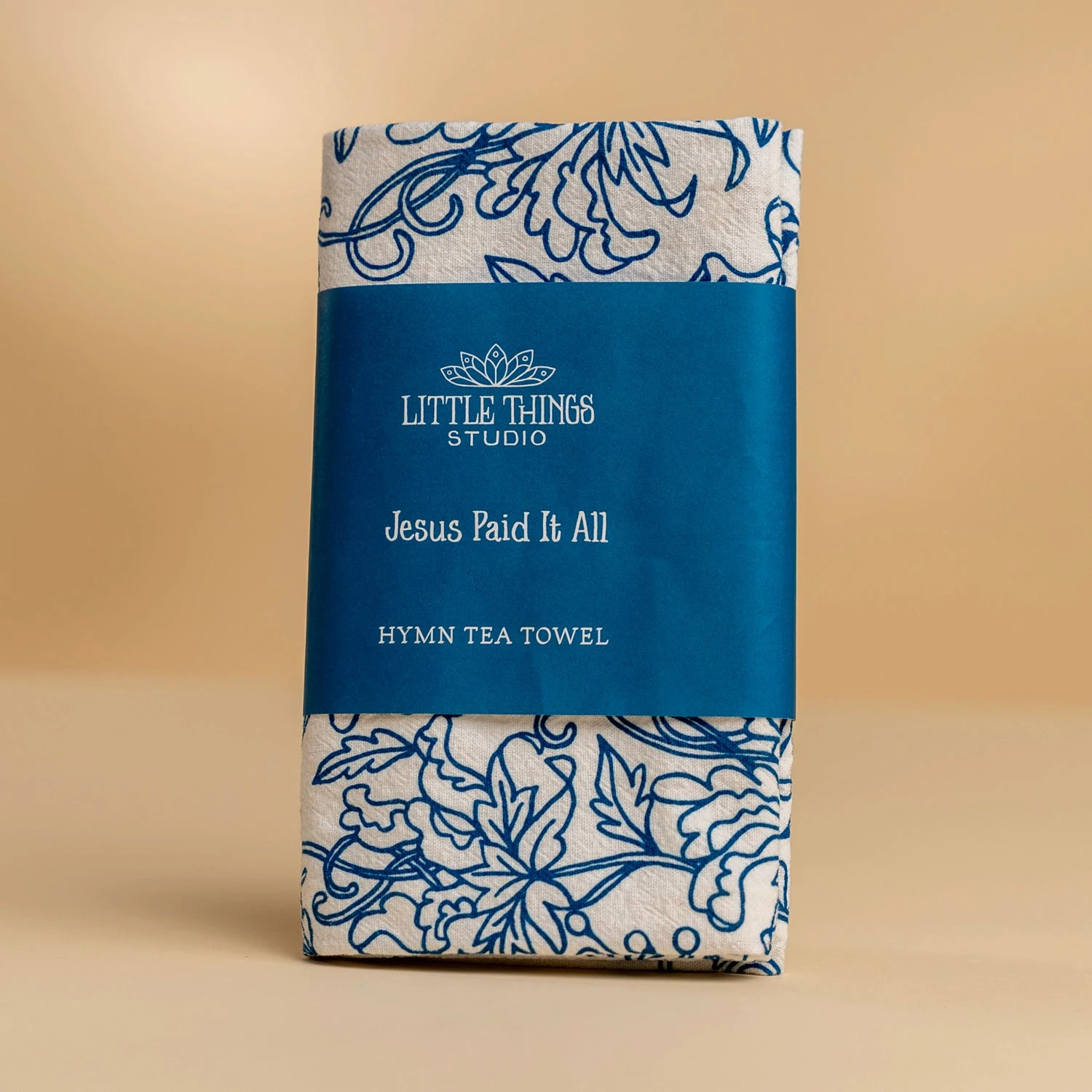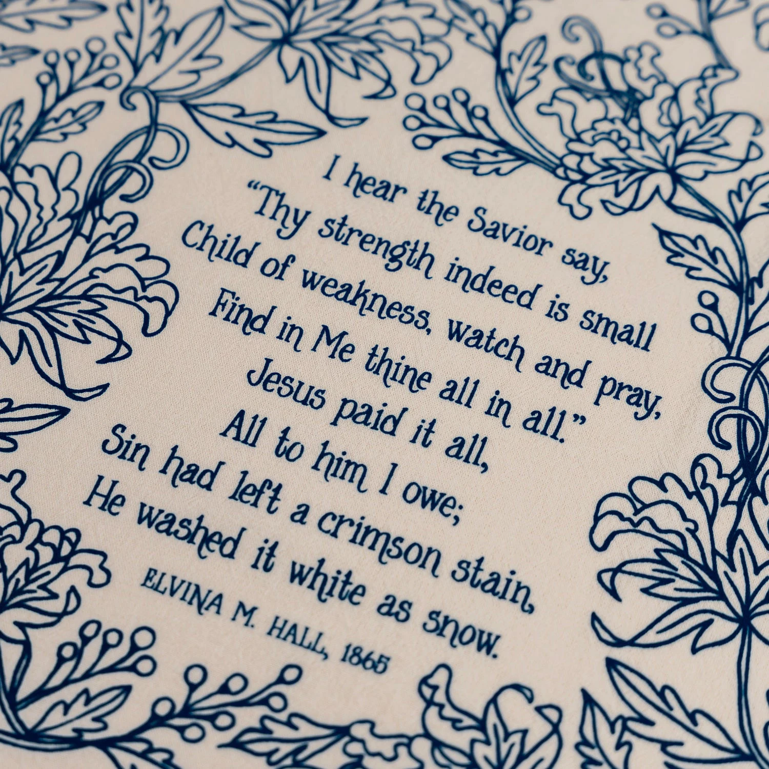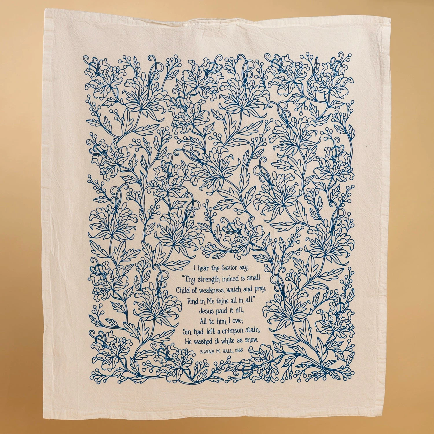Brighten your home with truth and song this The Jesus Paid It All hymn tea towel is printed in blue and features lyrics from the beloved hymn.