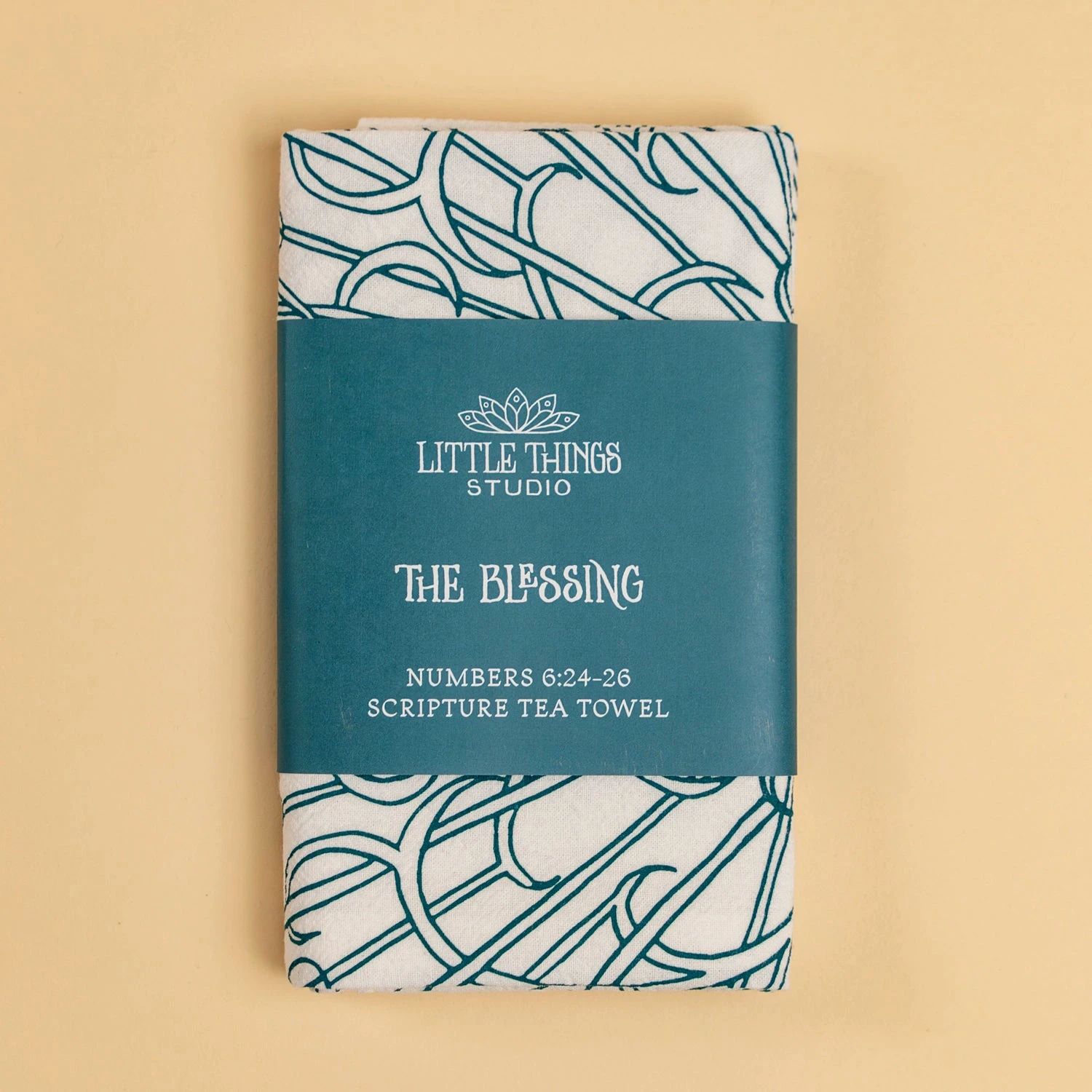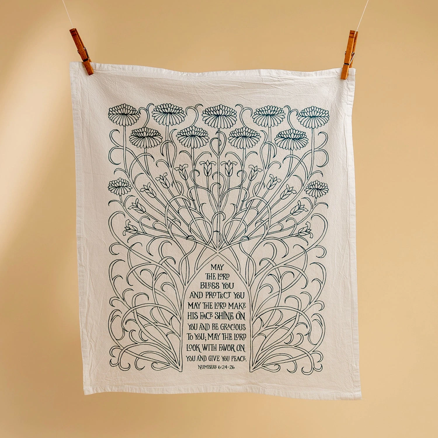 - “The Blessing” with floral design printed in muted teal
