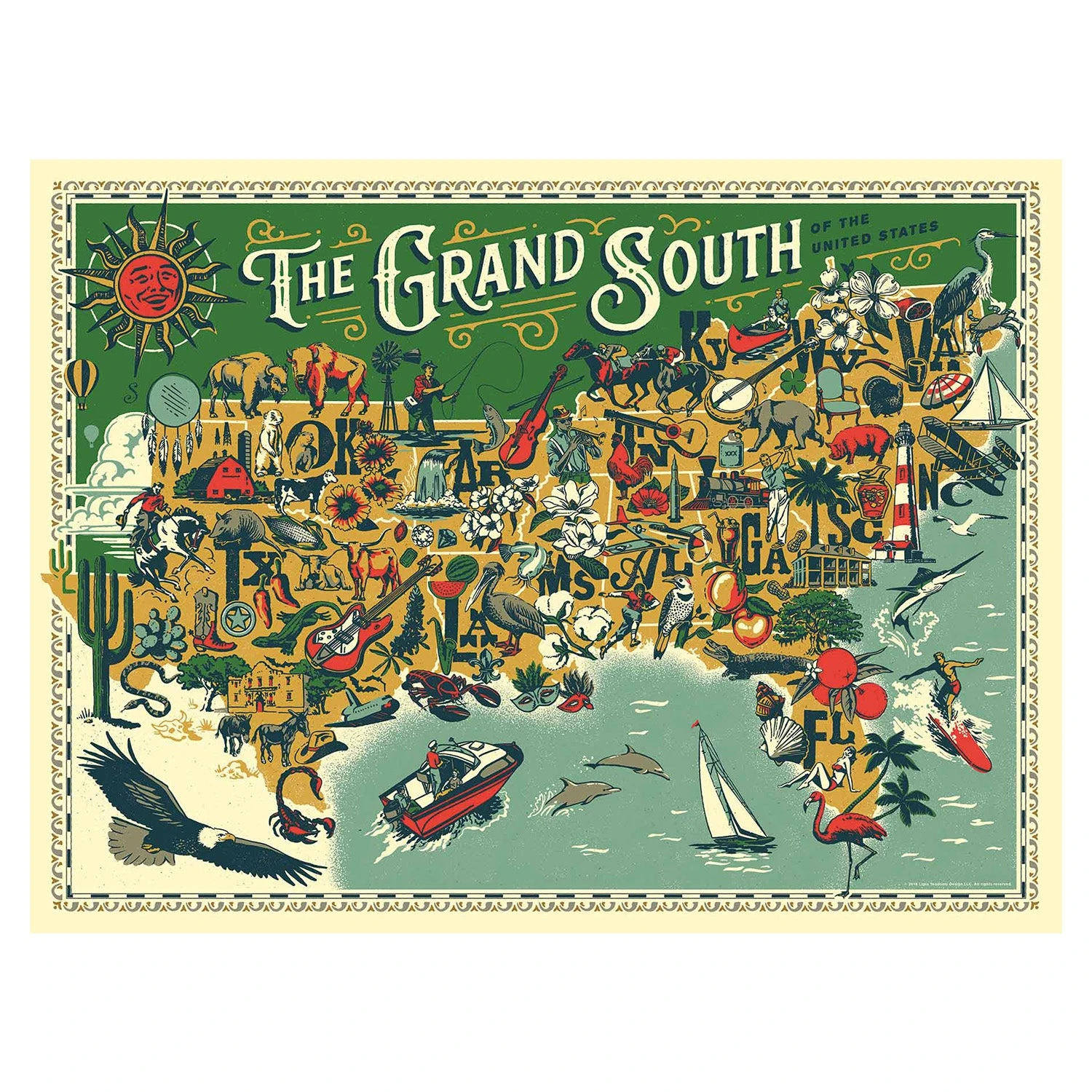 - Artistic Heritage: Features a beautifully illustrated vintage-inspired map by Ligia Teodosiu that captures the soul and landmarks of the Southern states.