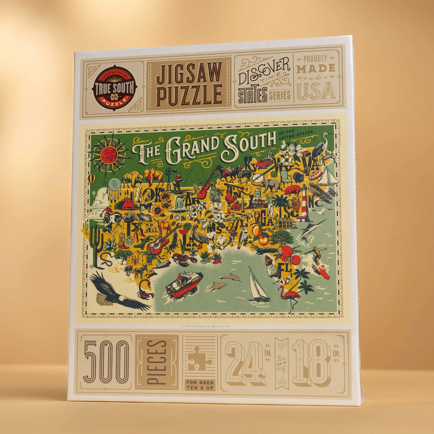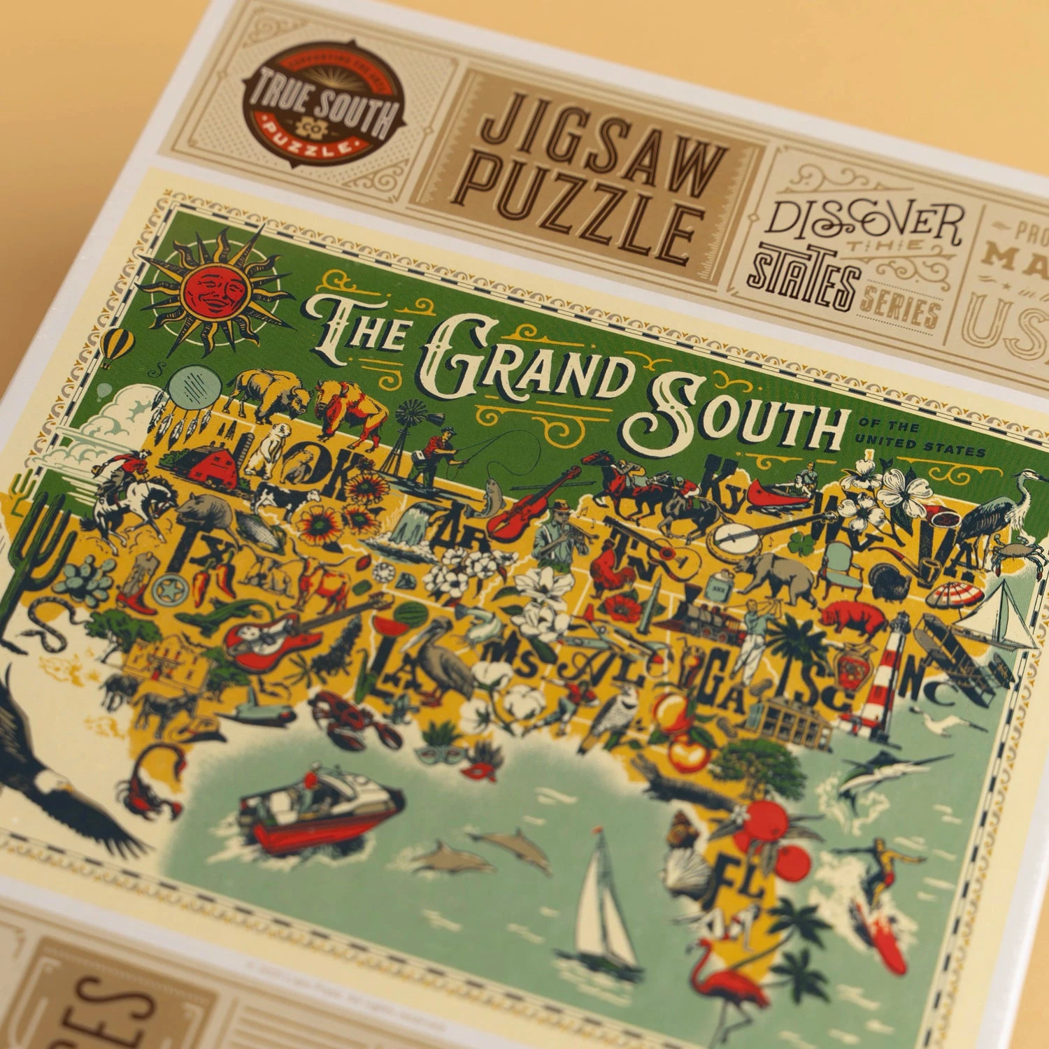 Join a journey through the heart of the Southern United States with the True South Grand South Puzzle. This exquisite collection piece celebrates Southern heritage, culinary traditions, and musical roots through vibrant colors and iconic cultural landmarks. Featuring a vintage-inspired map by renowned artist Ligia Teodosiu, it is the perfect way to slow down and enjoy the timeless essence of the South.